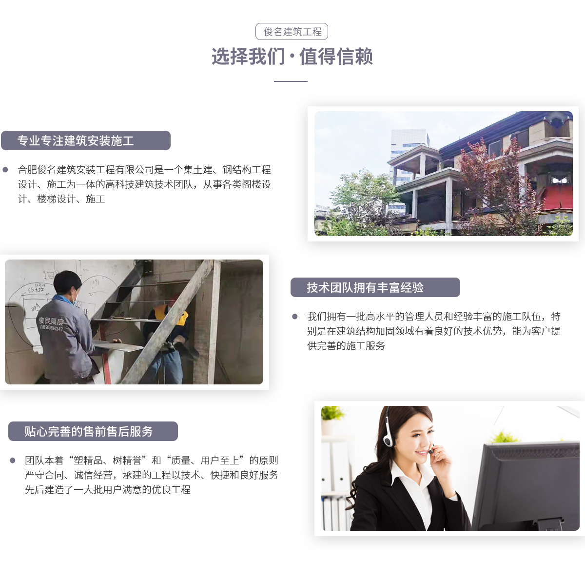 合肥俊名建筑安裝工程有限公司是一個(gè)集土建、鋼結(jié)構(gòu)工程設(shè)計(jì)、施工為一體的高科技建筑技術(shù)團(tuán)隊(duì),從事各類閣樓設(shè)計(jì)、施工。我們擁有一批高水平的管理人員和經(jīng)驗(yàn)豐富的施工隊(duì)伍,特別是在建筑結(jié)構(gòu)加固領(lǐng)域有著良好的技術(shù)優(yōu)勢。團(tuán)隊(duì)員工精誠團(tuán)結(jié),以“尊重規(guī)范,拒絕平凡”為宗旨,為客戶提供完善的施工服務(wù)。團(tuán)隊(duì)本著“塑精品、樹精譽(yù)”和“質(zhì)量、用戶至上”的原則,嚴(yán)守合同、誠信經(jīng)營,所...